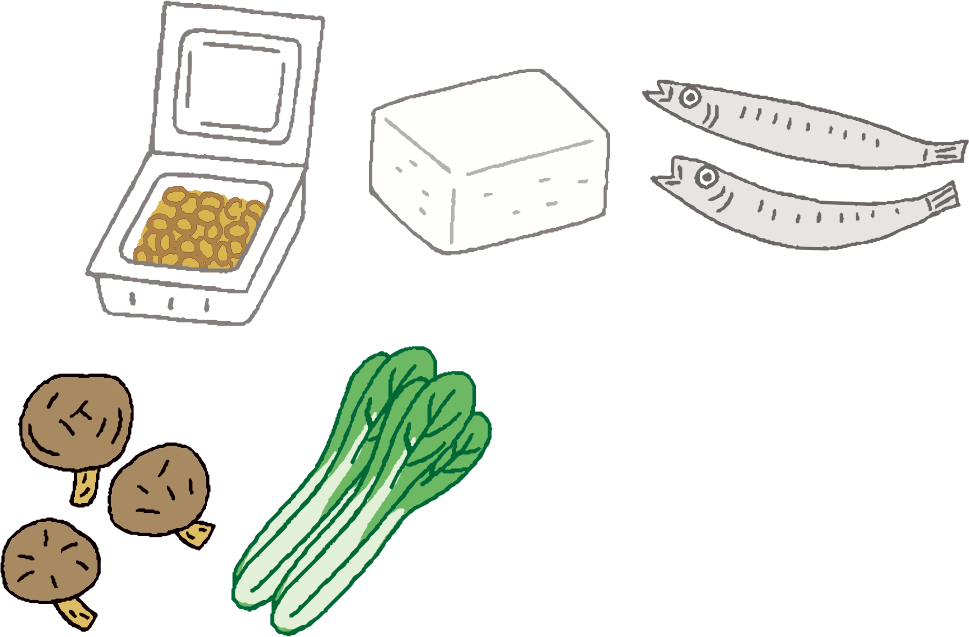 更年期世代に不足しがちなたんぱく質と、たんぱく質の代謝を助けるビタミンB群は毎日積極的に摂りたい栄養素。また、骨粗しょう症予防になるカルシウムやビタミンDを含む食品もこまめに摂りましょう。