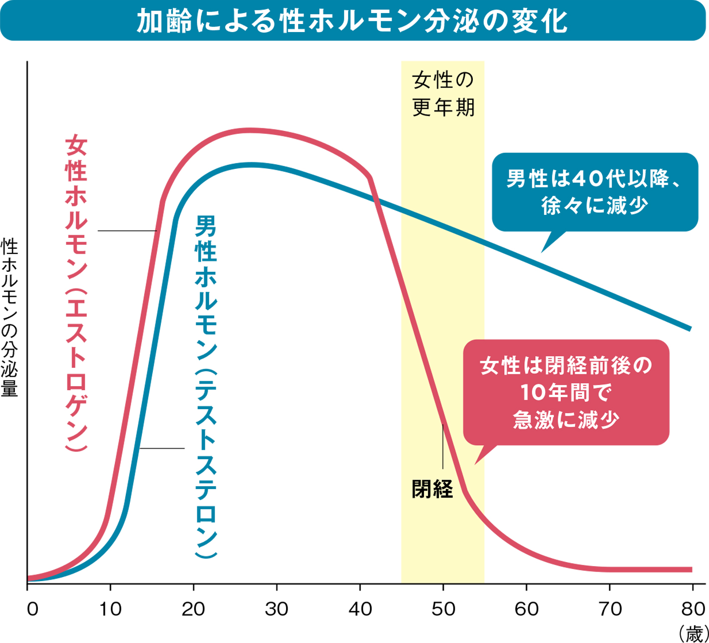 女性ホルモンの分泌の急激な低下やゆらぎが、更年期に伴う不調の主な原因です。また、男性も40代以降になると男性ホルモンの低下が原因による症状が出る場合があります。