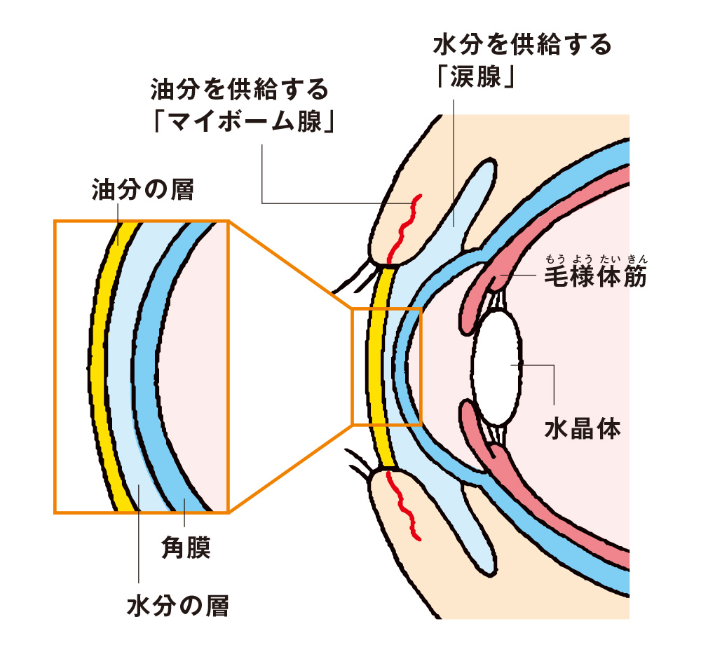 涙は層状になっていて、一番外側を油分が覆っています。水分は涙腺から油分はマイボーム腺から分泌されますが、油分が少ないと水分の蒸発を防ぐことができず、目が乾いてドライアイを発症します。