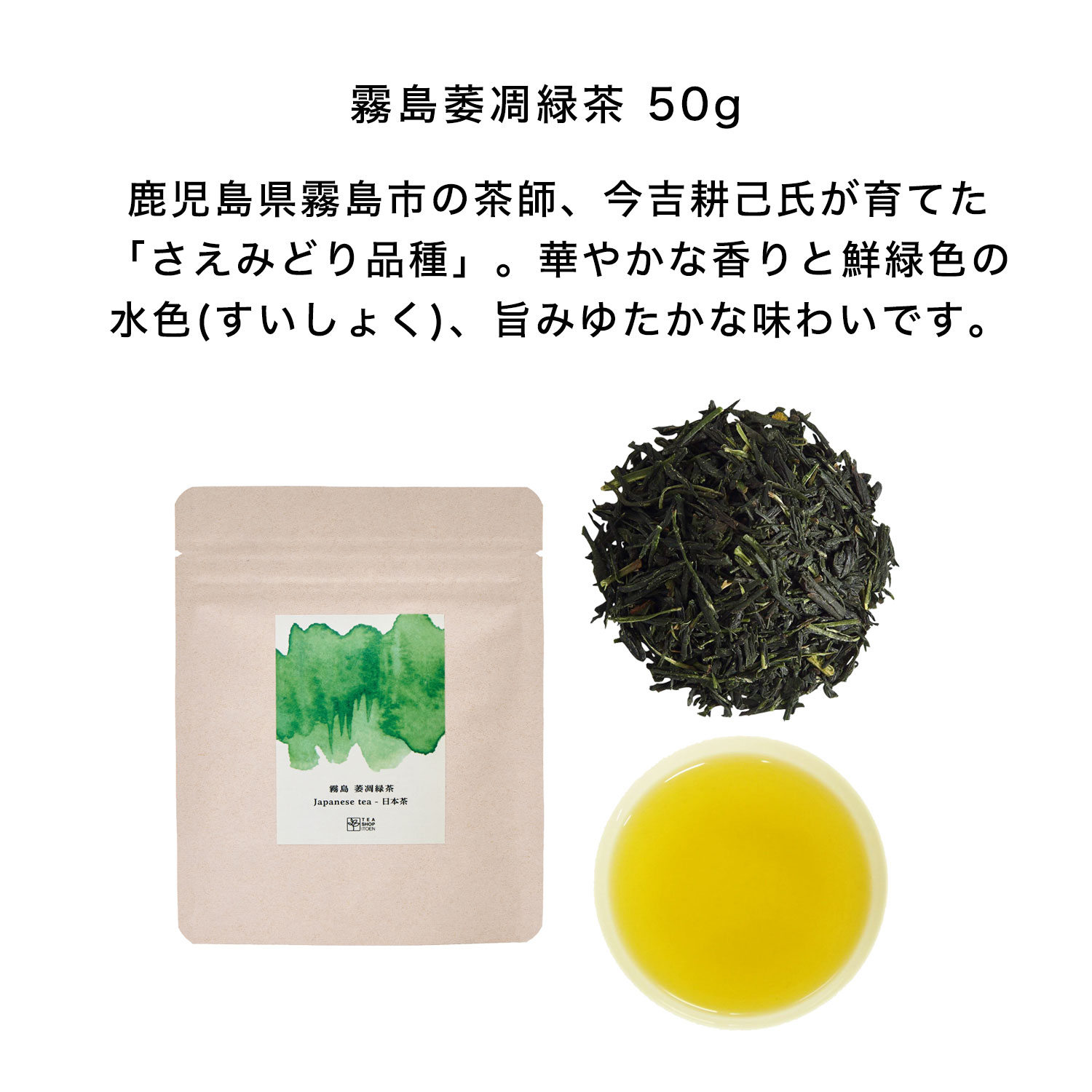 鹿児島県霧島市の茶師、今吉耕己氏が育てたさえみどり品種。華やかな香りと鮮緑色の水色(すいしょく)、旨みゆたかな味わいをおたのしみいただけます。