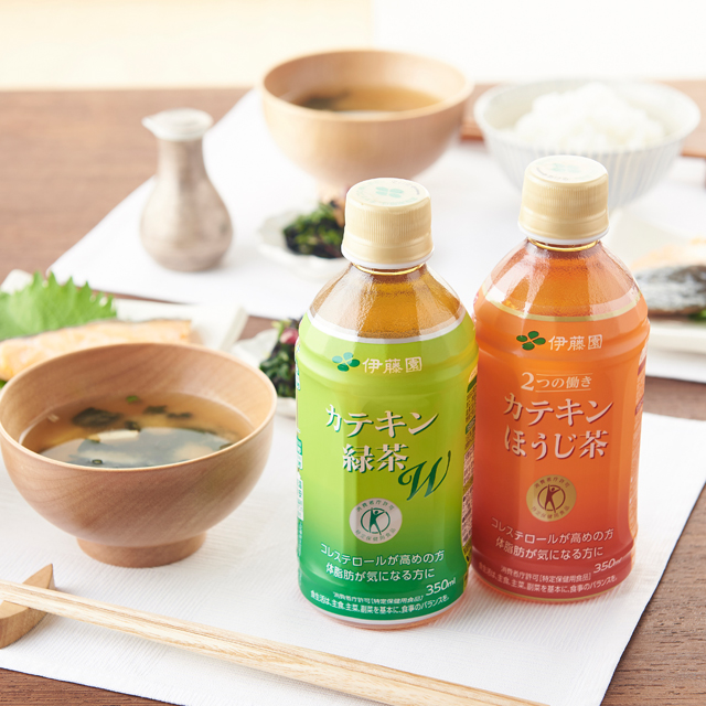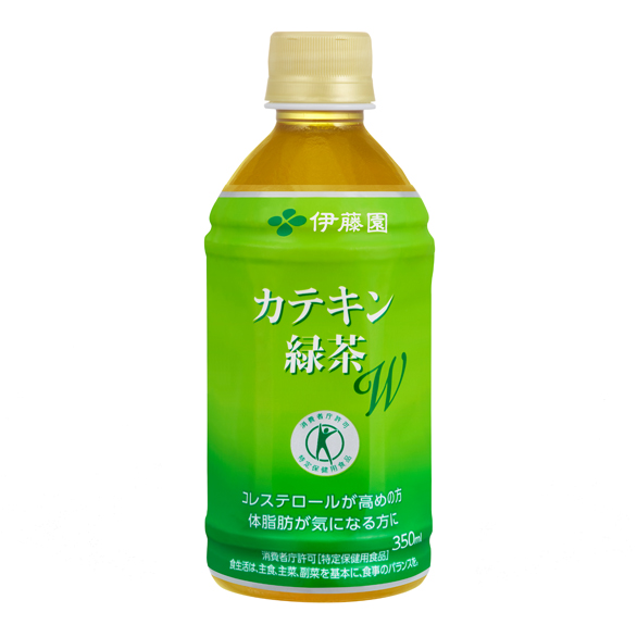 - カフェインは1本(350ml)当たり『カテキン緑茶W』は45mg、『2つの働き カテキンほうじ茶』は35mg含まれています。