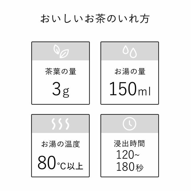 | 3g | 約150ml | 80℃以上 | 120~180秒 |