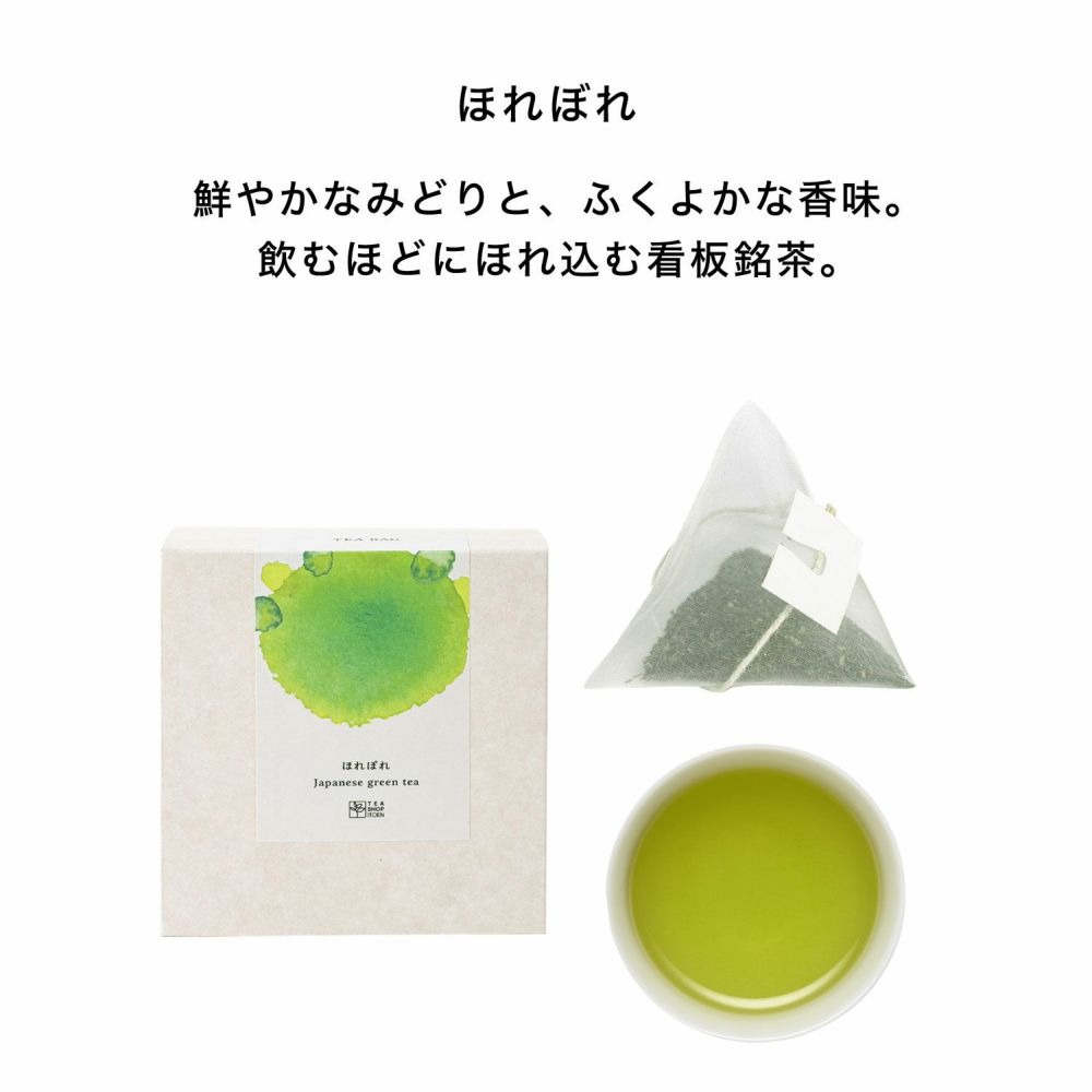 ●ほれぼれ ティーバッグ陽の光を遮って栽培した鹿児島県産の一番茶のみを使用。 新芽の爽やかな香りと、渋みの少ない豊かな旨味、鮮やかな緑色の水色(すいしょく)を引き出すため、 しっかり蒸した茶葉を丁寧に選り分け、後火仕上げしました。