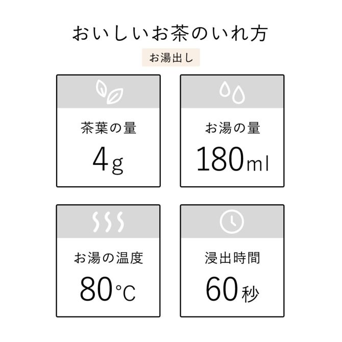 | 茶葉の量 | お湯の量 | お湯の温度 | 浸出時間 |
