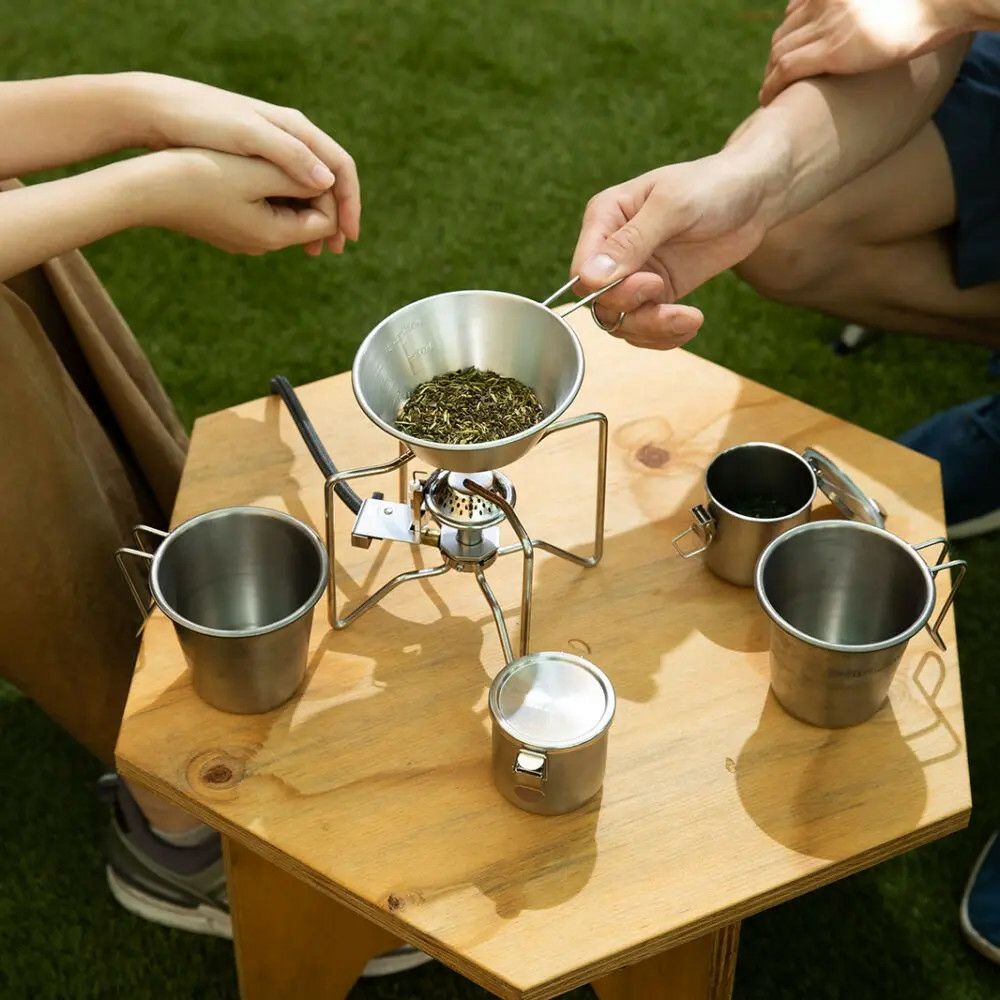 手軽に持ち運ぶことができるため、茶葉やティーバックを入れて、アウトドアシーンでも活躍。縦に重ねて置くこともできます。材質:ステンレス鋼(本体)、シリコン(パッキン)