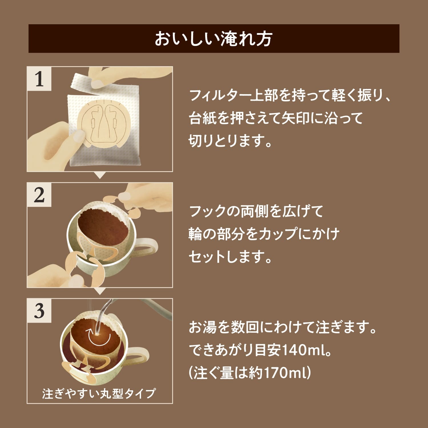 ブラジル産コーヒー豆の特長である、バランスに優れた風味豊かな味わいのドリップコーヒー。じっくりと長時間で焙煎を行い、ナッツのような香ばしさと甘さを引き立てました。ブラックで飲んでもミルクと合わせてもたのしめる味わい。