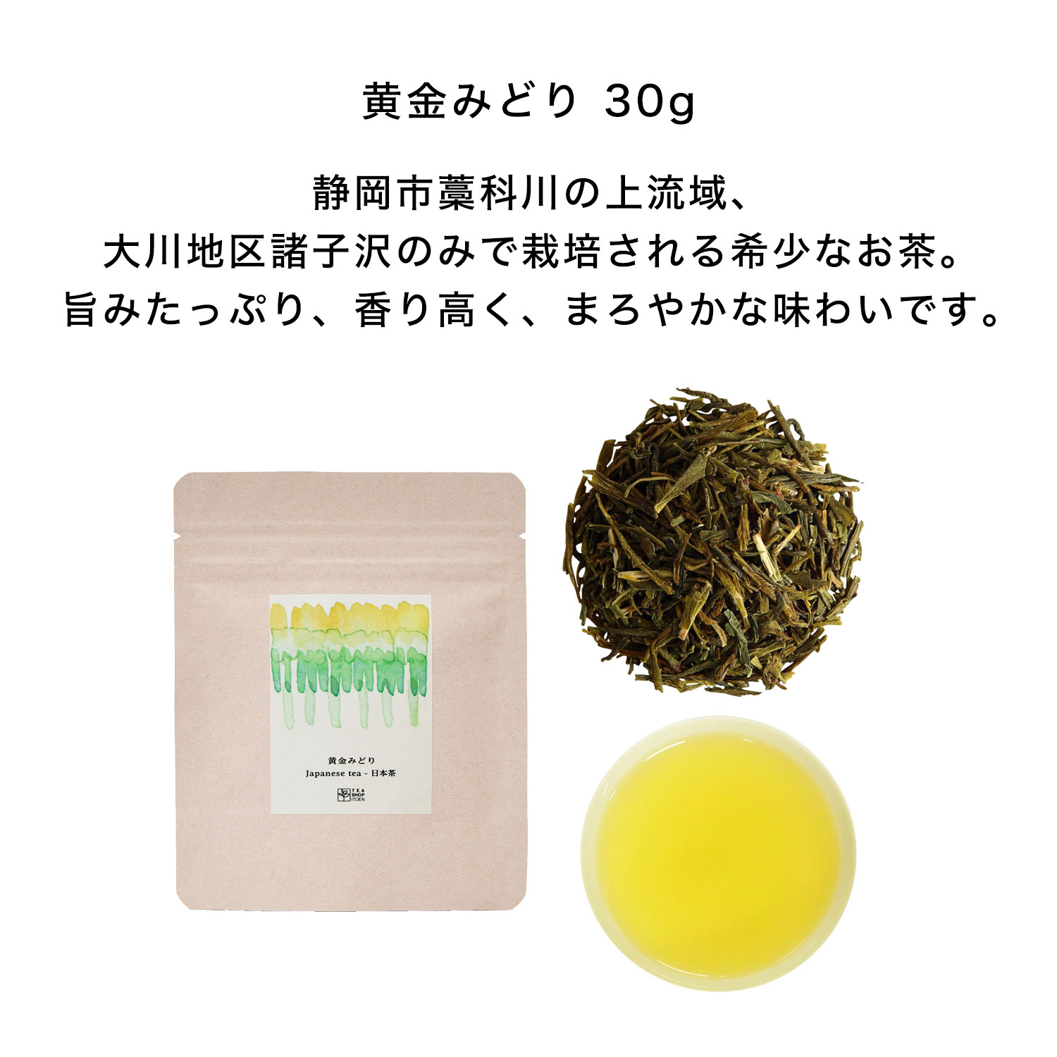 ●黄金みどり 30g静岡市藁科川の上流域、大川地区諸子沢のみで栽培される希少なお茶です。陽の光によって新芽だけが黄色くみえる「黄金みどり」。 年に3度ある黄金期には、幻想的な風景が広がります。旨みたっぷり、香り高く、まろやかな味わい。甘みが口から鼻に抜け、ひとときの幸せに包まれます。