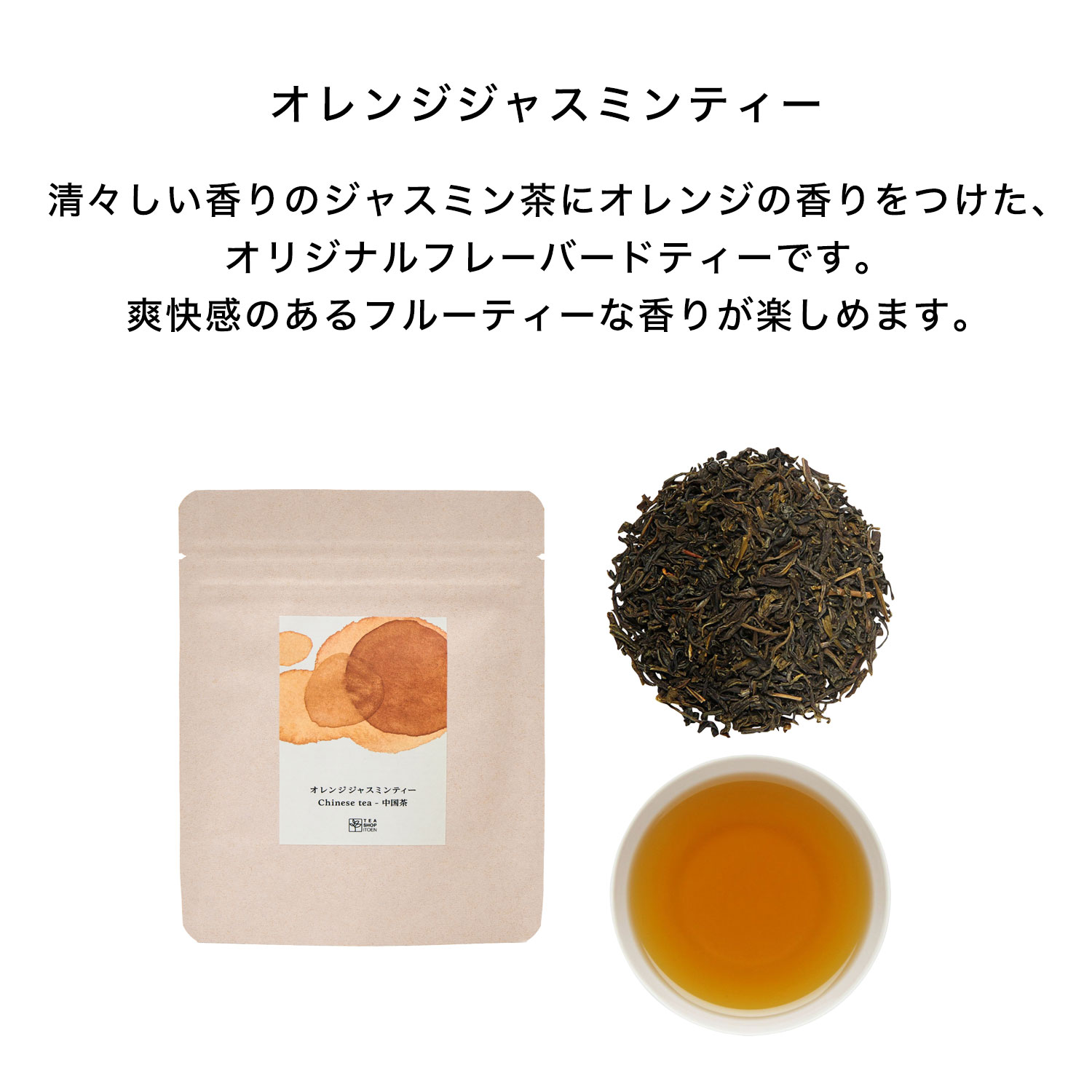 清々しい香りのジャスミン茶にオレンジの香りをつけた、オリジナルフレーバードティー。爽快感のあるフルーティーな香りがたのしめます。