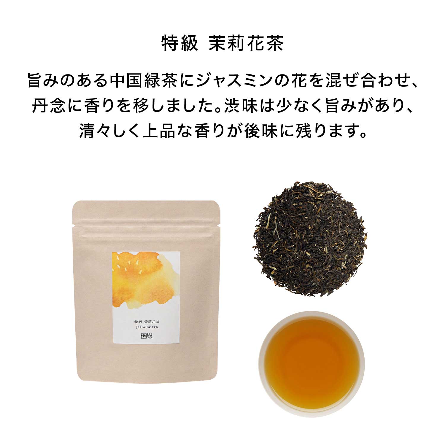 旨みのある中国緑茶にジャスミンの花を何度も混ぜ合わせ、丹念に香りを移しました。渋味は少なく旨みがあり、後味にまで清々しく上品な香りが残ります。