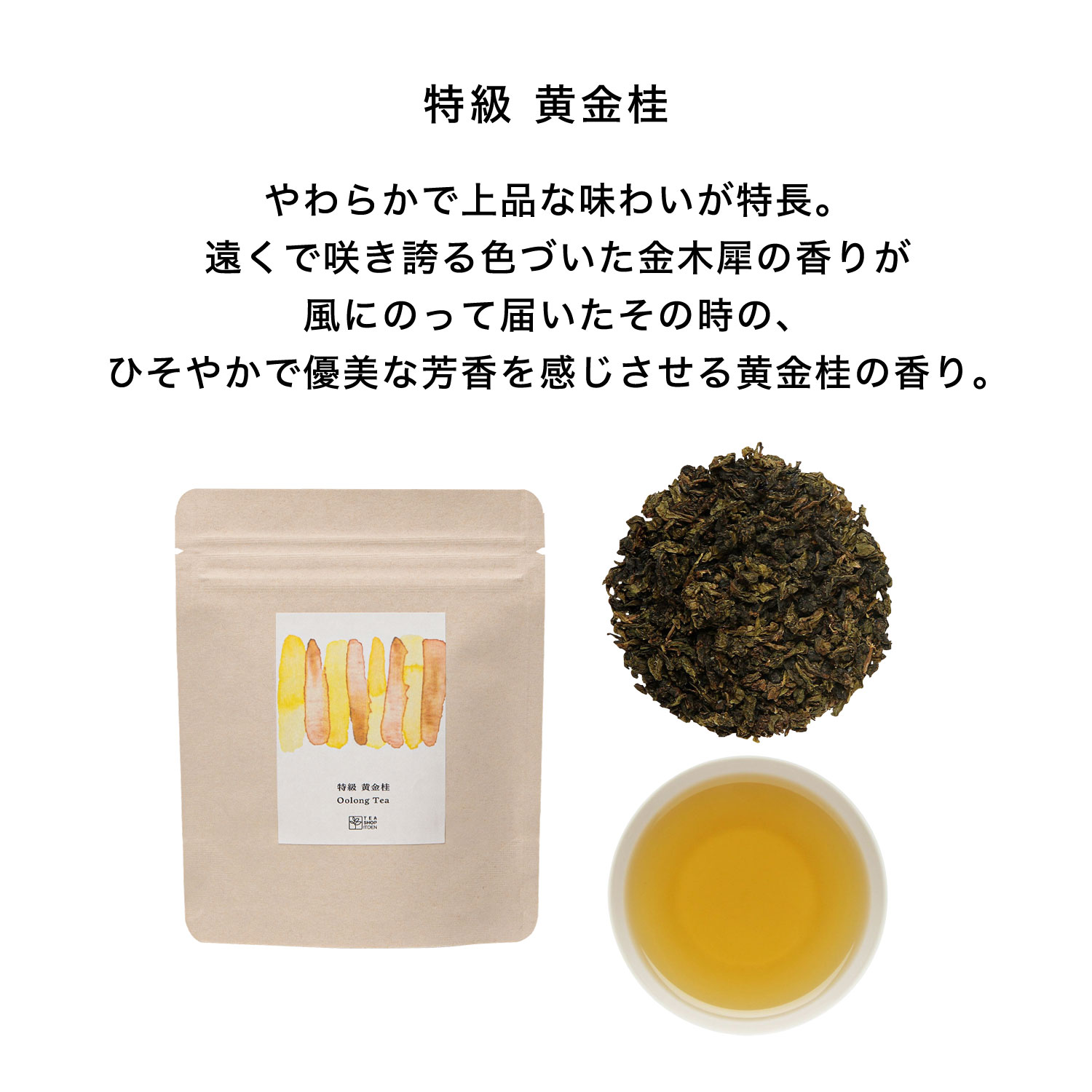 美しい黄金色に輝く透明感の水色(すいしょく)と、やわらかで上品な味わいが特長。金木犀にたとえられる優雅な甘い香りのお茶です。