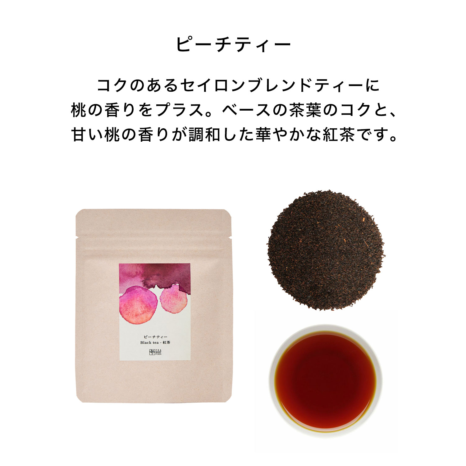コクのあるセイロンブレンドティーに桃のフレーバーをプラス。ベースの茶葉のコクと、甘い桃の香りが調和しています。 渋みが少なく、ほのかな甘みのある味わいが特長です。