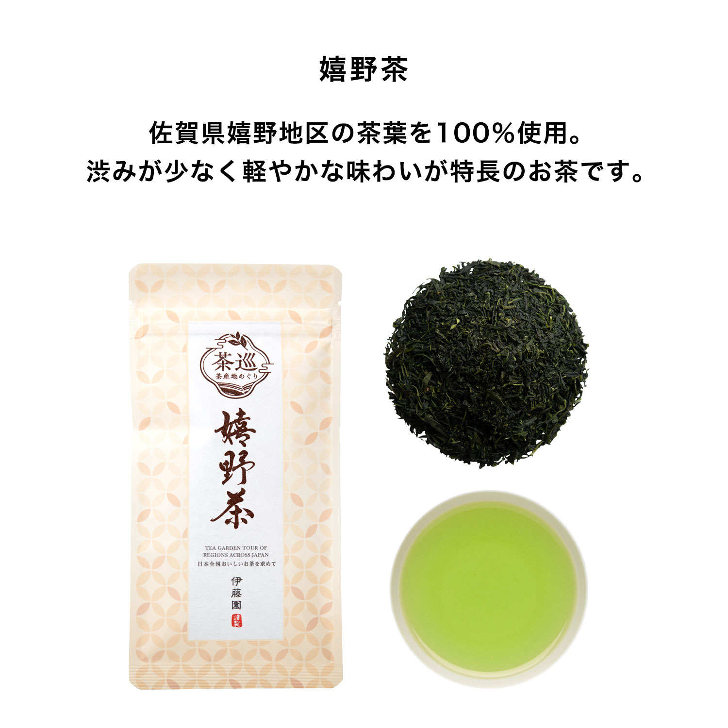 佐賀県産の茶葉を100%使用。ぐりっとした丸い形の茶葉で、鮮やかな水色(すいしょく)とまろやかな味わいの緑茶です。