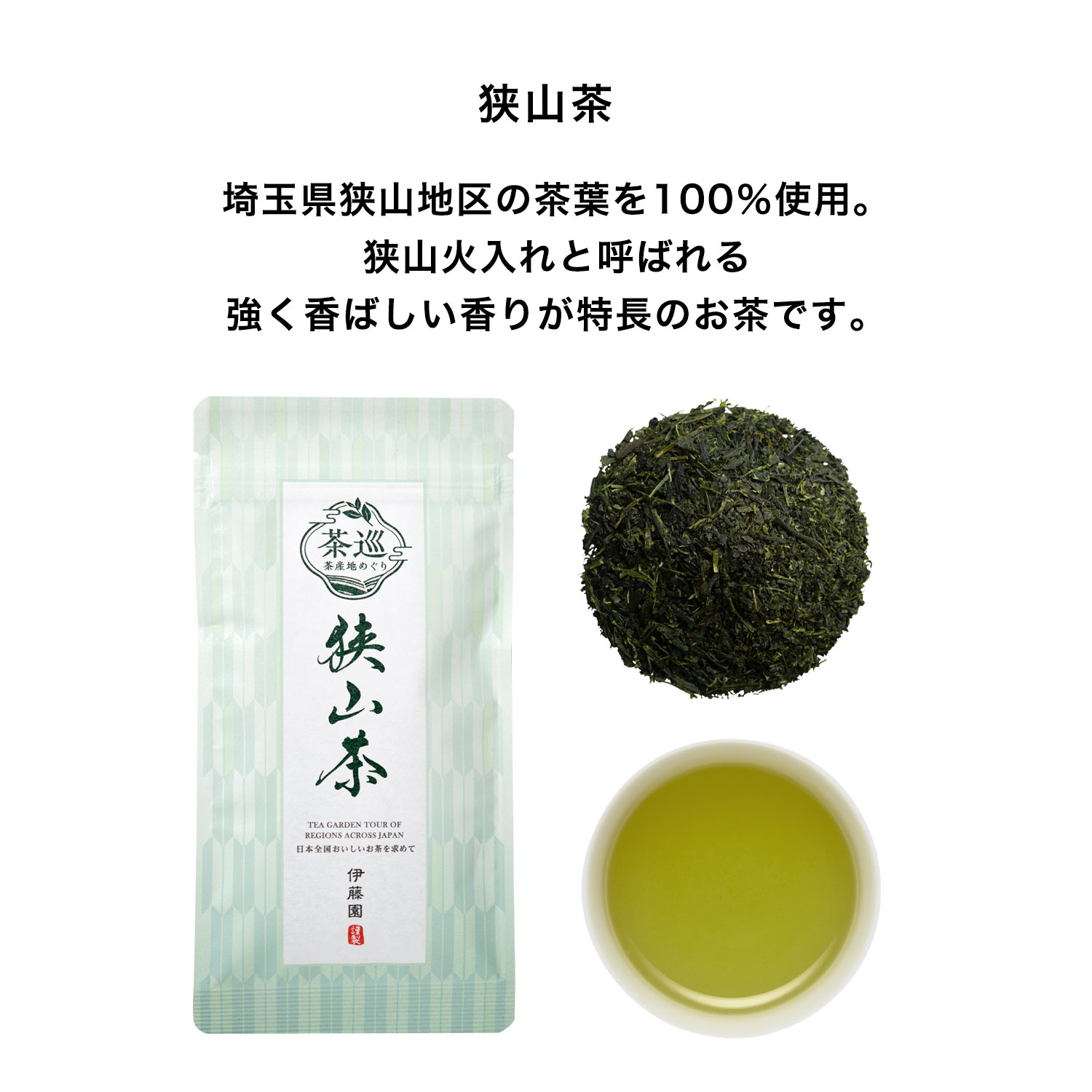 埼玉県狭山産の茶葉を100%使用。旨みの多い一番茶と色の良いかぶせ茶で、香り、味わい、水色(すいしょく)を引き出した緑茶です。