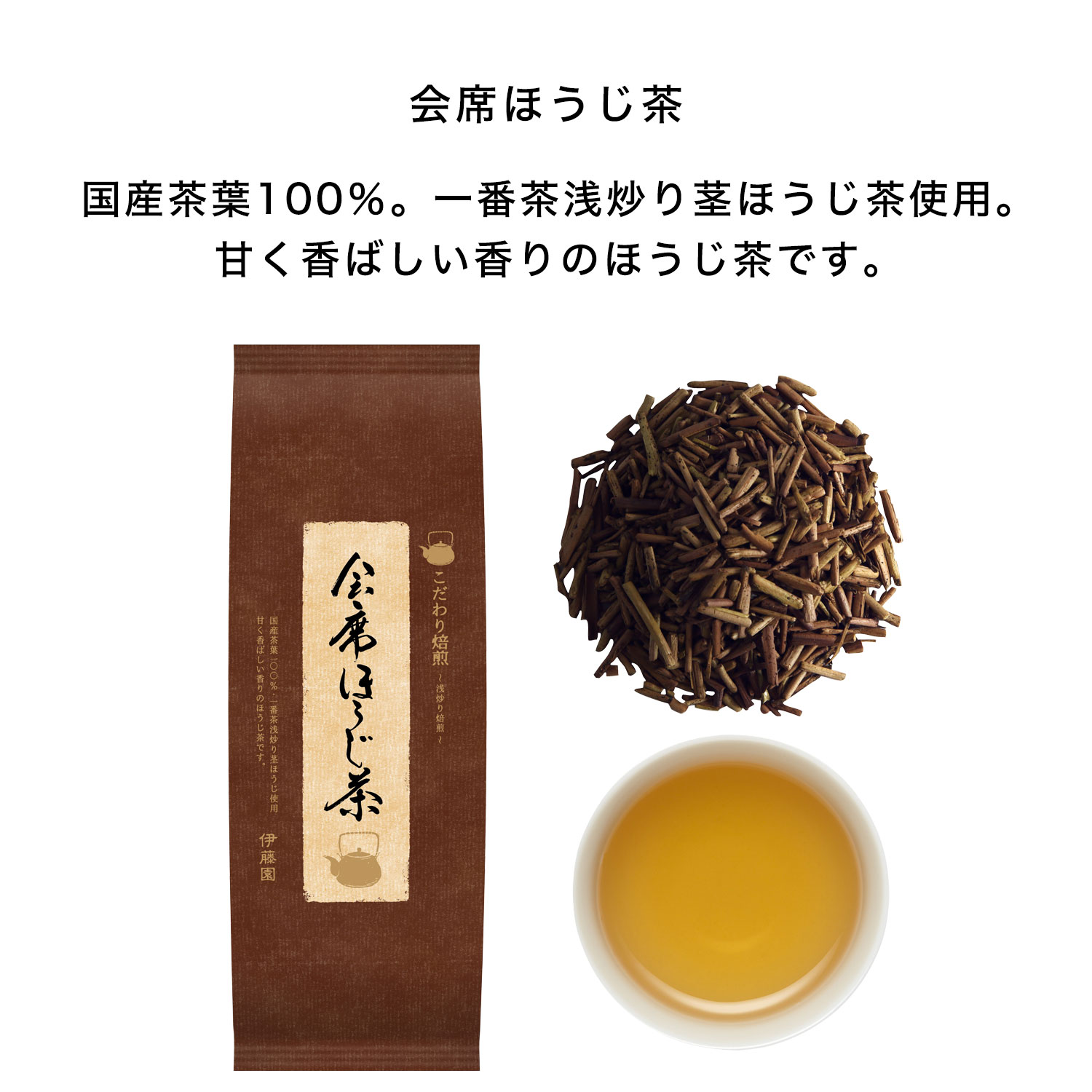 一番茶の渋みの少ない茎の部分だけを使って、軽く煎ってさっぱりと仕上げました。甘く軽やかな味わいです。