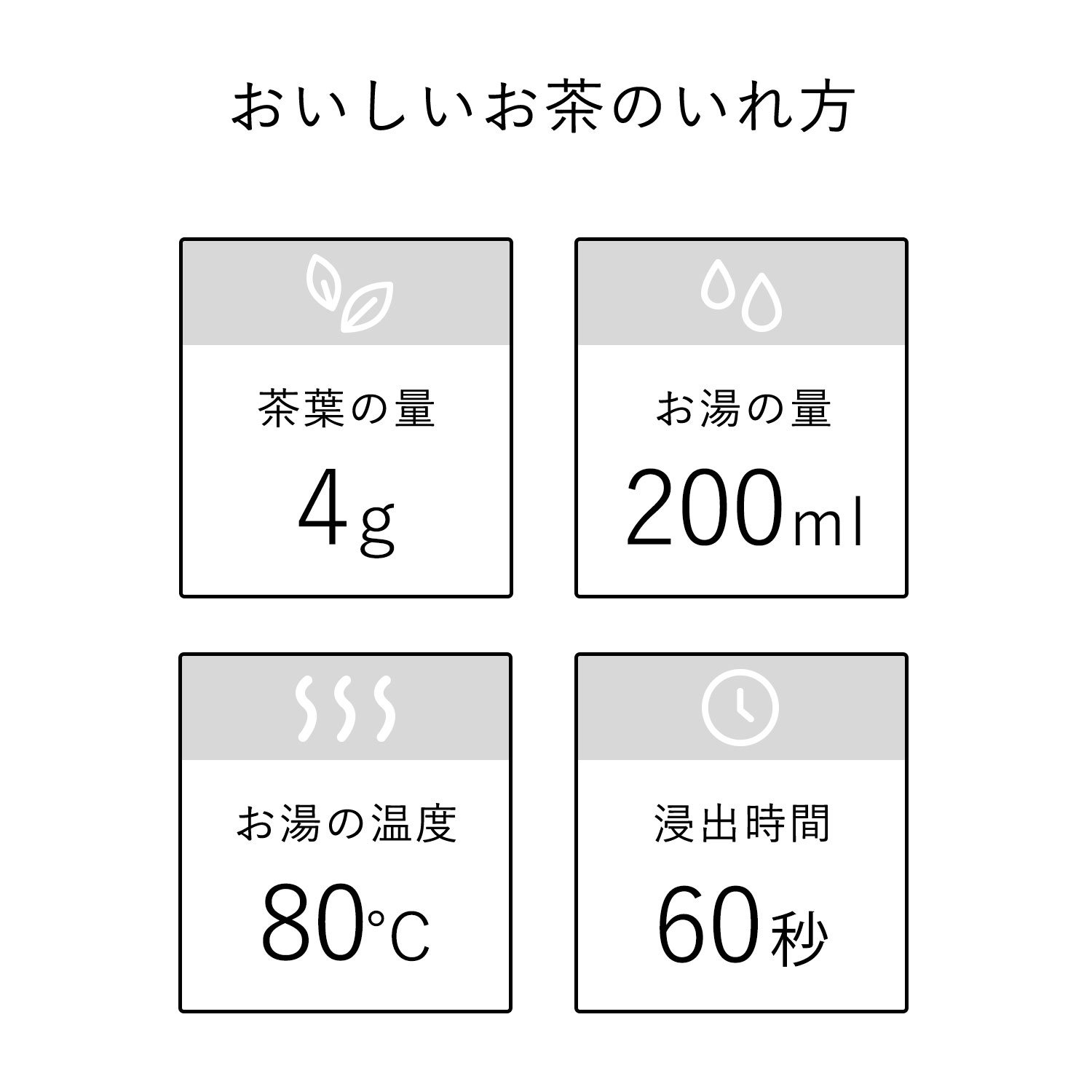 | 茶葉の量 | お湯の量 | お湯の温度 | 浸出時間 |