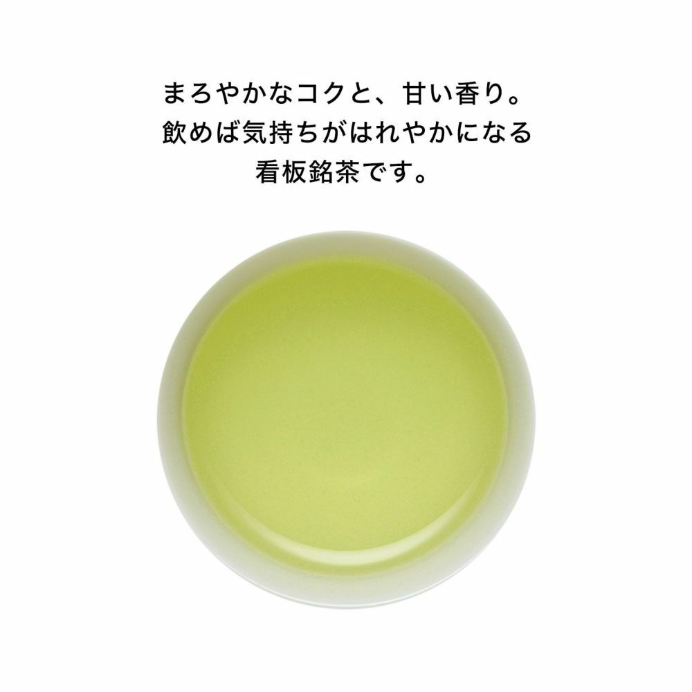 まろやかなコクと甘い香り、飲めば気持ちがはれやかになる看板茶です。 やわらかでみずみずしい静岡県産一番茶を使用。 水色(すいしょく)に優れ、コクと旨みをもつ茶葉を、絶妙なバランスでブレンドしました。 香りをより豊かに引き出すために、こだわりの火入れで丹精込めて仕上げています。