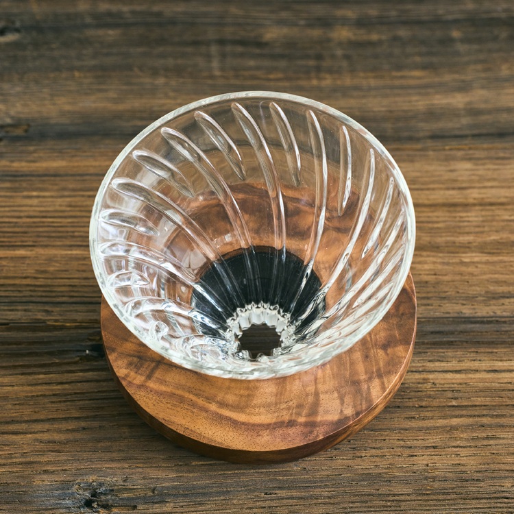 ドリップホルダーにウォールナットを使用したドリッパー。HARIO V60の円すい型は縦にコーヒー粉の層が厚くなり、お湯が円すいの中心に向かって流れる事でお湯がコーヒー粉に長く触れ、豆の味・香り・旨みをしっかり抽出します。