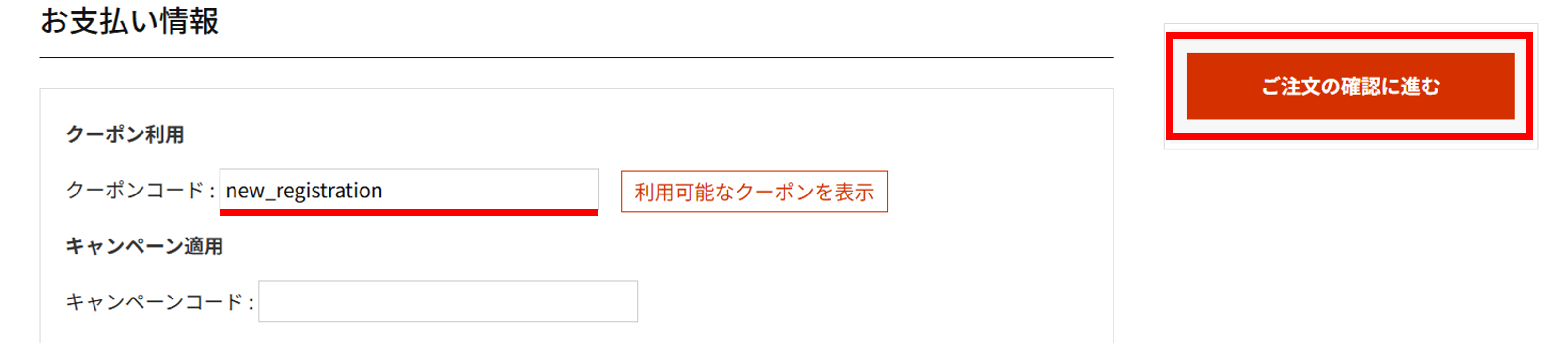 当ページ内の「お支払い情報」の「クーポン利用」の欄にて、クーポンコードを入力してください。