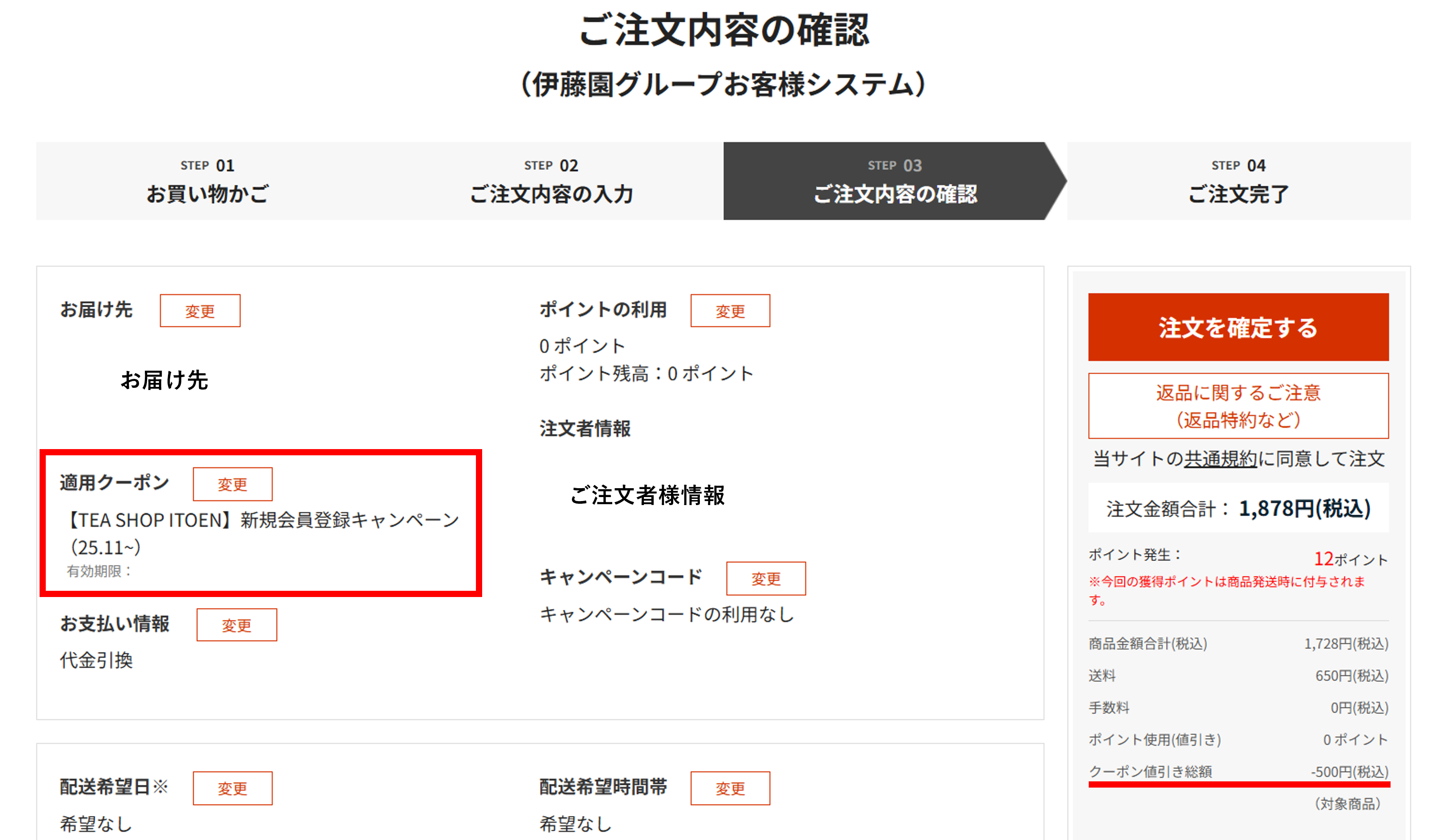 「適用クーポン」欄にて、入力したクーポンが反映されます。