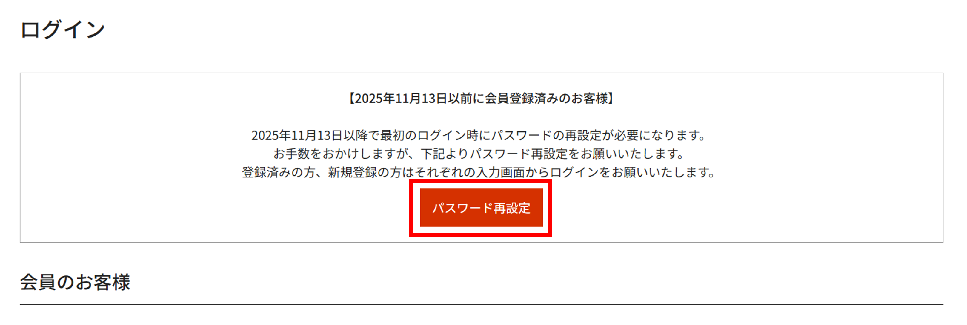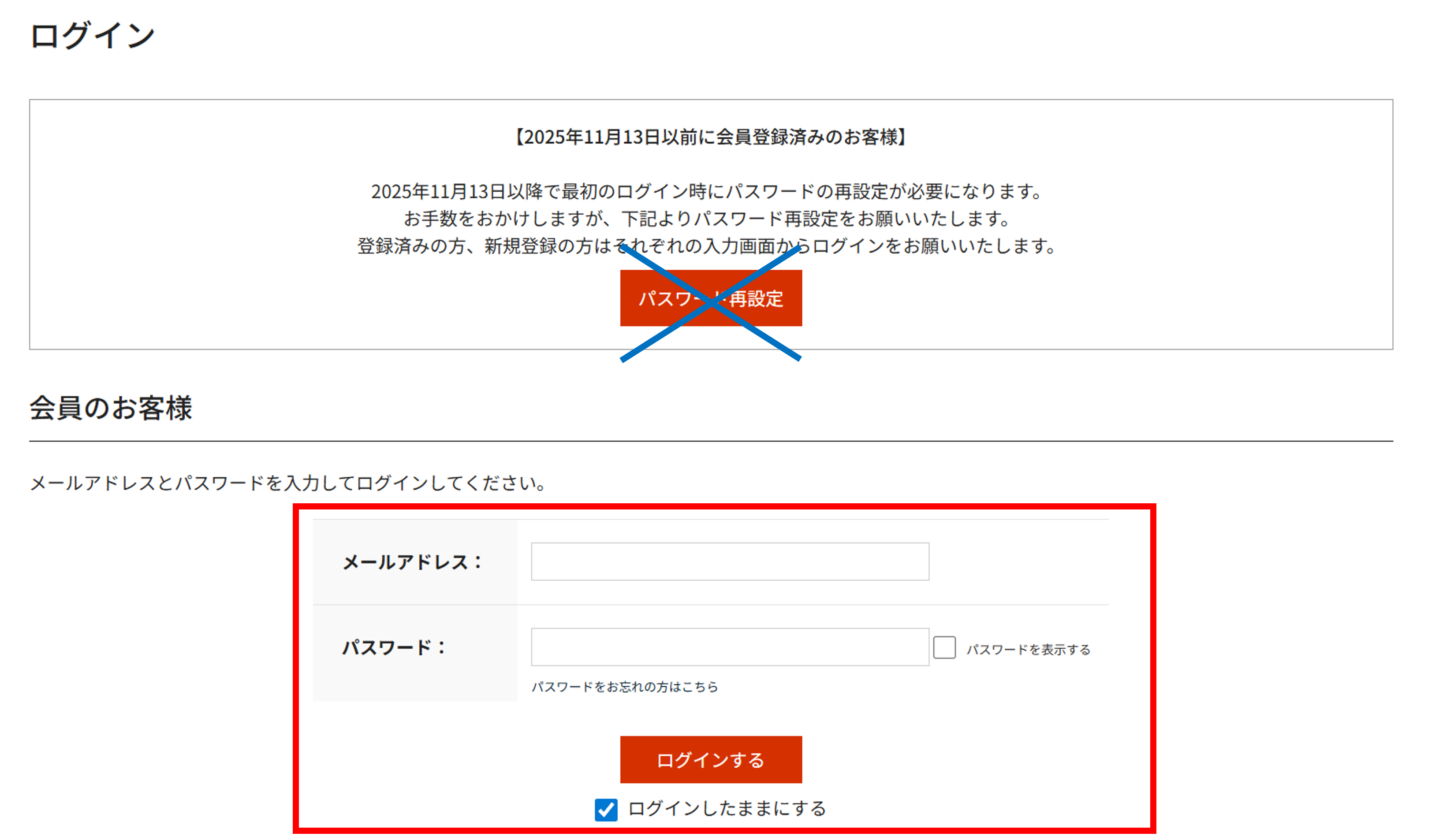 7. 会員のお客様欄にあるメールアドレスと、新しく設定したパスワードをご入力ください。